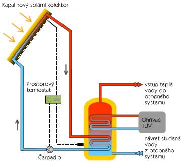 Jakmile se nemrznoucí směs dostane do zásobníku, předá tepelnou energie vodě. Voda se ohřívá na 50 °C a poté přirozeně stoupá vzhůru. Díky tomu se může teplota vody vyšplhat až na hranici 90 °C, což je v kapalném stavu maximum. Ze zásobníku se přes vývod dostane až do umyvadla, sprchy či dřezu. Mezi tím se nemrznoucí směs vrací zpět do kolektorů, aby se mohla opět nahřát.